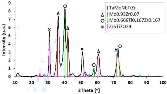 To identify the compounds’ lattice parameters in the alloy, the initial structural characterization performed by X-ray diffraction was refined using the Rietveld technique and TOPAS program. The X-ray diffractogram of the TaMoNbTiZr multicomponent alloy is presented in Figure 7. Along with the TaMoN TiZr solid solution, three more phases appear, namely MoNbTa, Ti4Nb, and Ti0.879Nb0.121.