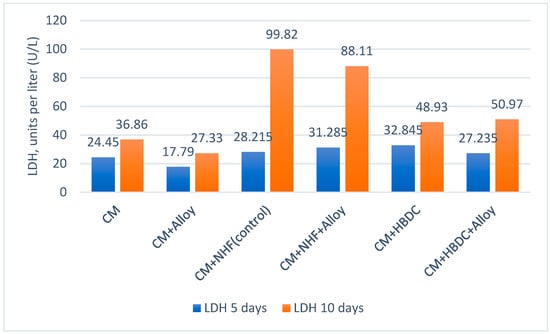 From the data presented in Figure 11, a slight increase in LDH activity was recorded after 10 days, both in the control wells in which the cells were cultured without alloy and in the wells in which the cells were cultured in the presence of alloy. The increase in LDH activity in both situations demonstrates that certain cytolysis phenomena occurred even in the absence of alloy. Higher values of LDH activity were observed in the wells cultured with NHF, probably due to the more intense proliferation of this cell line. A possible cause of the occurrence of apoptosis and necrosis in in vitro cell cultures can be determined by the overcrowding of the culture surface with cells at over 80–90%. In the analyzed wells, NHF reached 100% confluence, with areas of overlapping (overcrowding) of cells in the well after 10 days of contact with the alloy. Lower LDH increases were recorded in the presence of the metal alloy compared to the case when only NHF cells were tested in the same culture medium. When the alloy sample was introduced into the culture medium with HBMDC, the amount of LDH increased slightly after 10 days of maintenance from 48.93 to 50.97 units per liter (U/L).