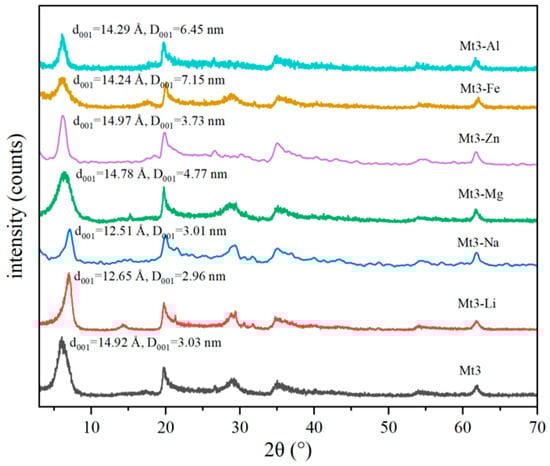 3.2.1. The Effect of Different Metal Cations Regulation on the Interlayer Structure of Montmorillonite