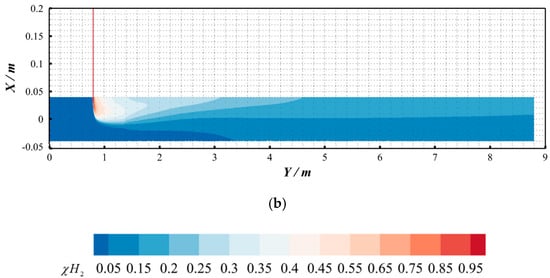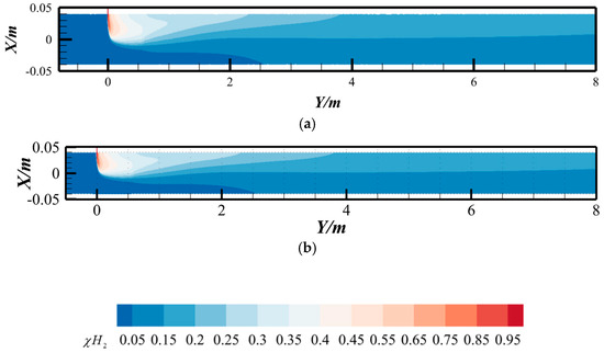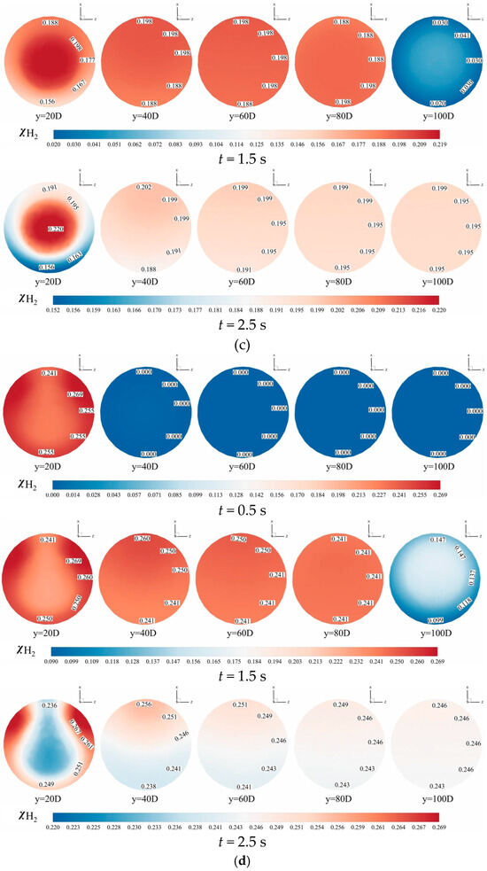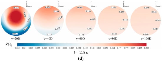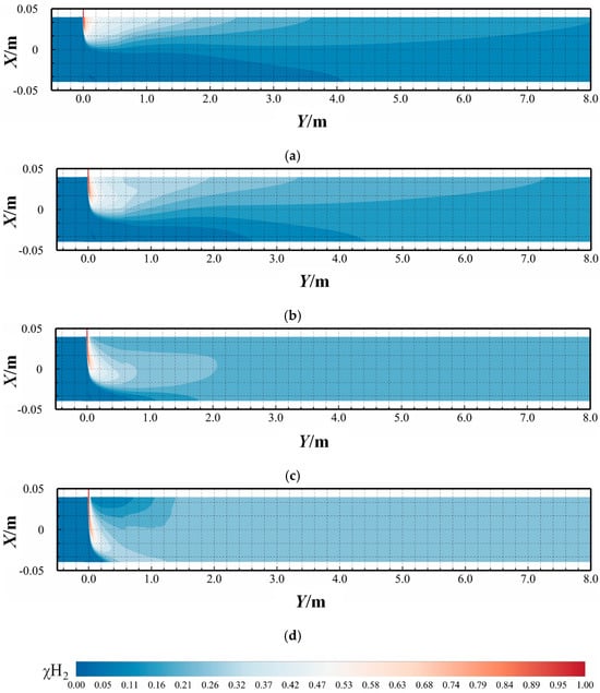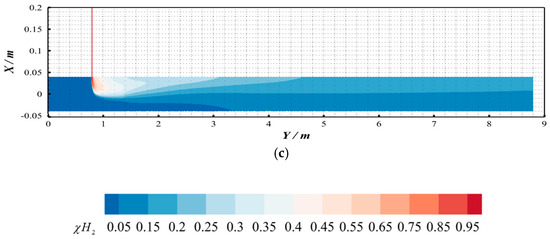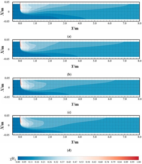 2 = 0.7918%) under hydrogen-blended pipeline conditions. The hydrogen molar concentration contours at the