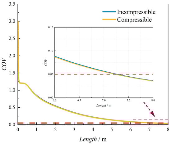 Figure 3). A pink dashed box (denoted by the red arrow) highlights the locally enlarged area to provide detailed structural visualization. The variations in the coefficient of variation (COV) along the pipeline length are highly consistent. This also indicates that, under the conditions of this study (temperature of 288 K and pipeline pressure of 3.5 MPa), considering compressibility has little influence on the hydrogen–methane mixing process. This finding is also consistent with the results of Gondal [