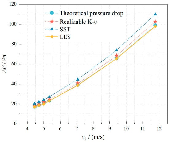 35] confirmed that the simulation results are consistent with those generated by the realizable k-epsilon turbulence model. Furthermore, a comparative analysis of pressure drop values under varying flow velocities was conducted using three turbulence models: the Large Eddy Simulation (LES) with the WALE subgrid-scale model, the Realizable k-ε model, and the k-ω SST model. The simulated results were validated against theoretical pressure drop predictions, as illustrated in