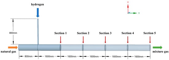 The entire industry chain of hydrogen energy comprises three key stages: hydrogen production, hydrogen storage and transportation, and hydrogen utilization. Among these, large-scale, long-distance, and low-cost hydrogen storage and transportation represent the bottleneck restricting the development of hydrogen energy. To address this, some scholars have proposed utilizing existing natural gas pipelines for hydrogen transportation by blending hydrogen with natural gas. This approach avoids the challenges associated with newly constructed pure hydrogen pipelines, such as high initial investment costs, elevated operational expenses, and insufficient supporting infrastructure. Additionally, hydrogen can partially replace natural gas consumption, thereby reducing carbon emissions. Therefore, blending hydrogen into natural gas pipelines remains the optimal solution for hydrogen storage and transportation. However, the flow dynamics of hydrogen–natural gas mixtures in pipelines are not yet fully understood, making it imperative to conduct simulation research on the process of mixing hydrogen into natural gas pipelines.
