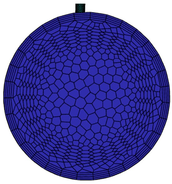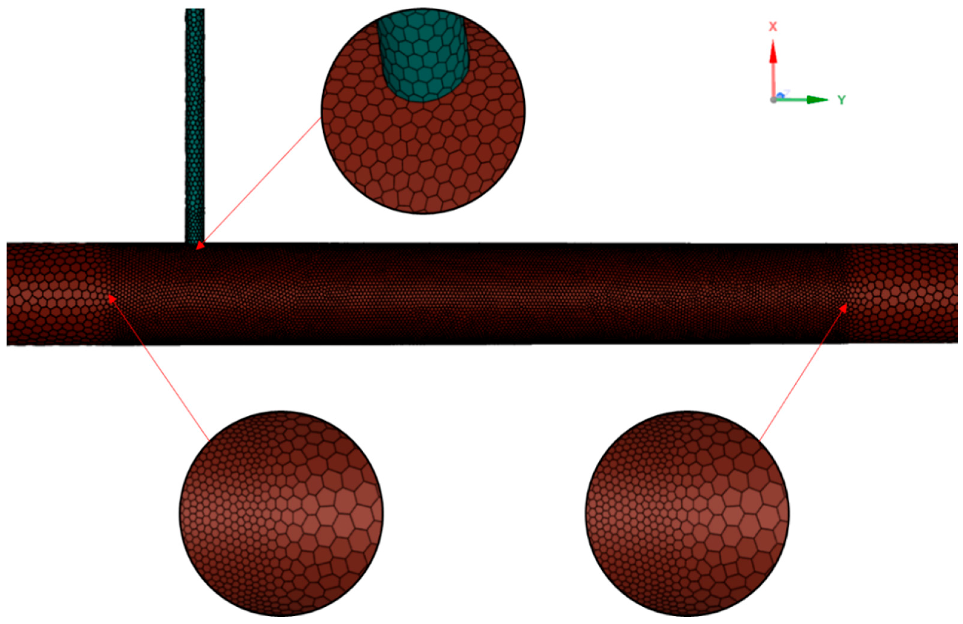 The computational meshing methodology critically impacts numerical accuracy and convergence behavior. This study employs a hybrid Poly-Hexcore meshing based on “Mosaic” technology, strategically combining hexahedral-dominated core regions with polyhedral transitional zones. Three key meshing principles were implemented: (1) The Mosaic-enabled Poly-Hexcore topology achieves seamless node matching between hexahedral and polyhedral domains (As shown in the enlarged view above the pipeline in