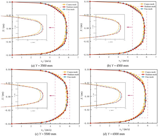 The outlet section velocity of the three meshes were statistically analyzed. The results showed that the relative error between the simulated values of the outlet average velocity was from 0.83% to 1.89%, respectively, from fine to coarse, which met the accuracy requirements.