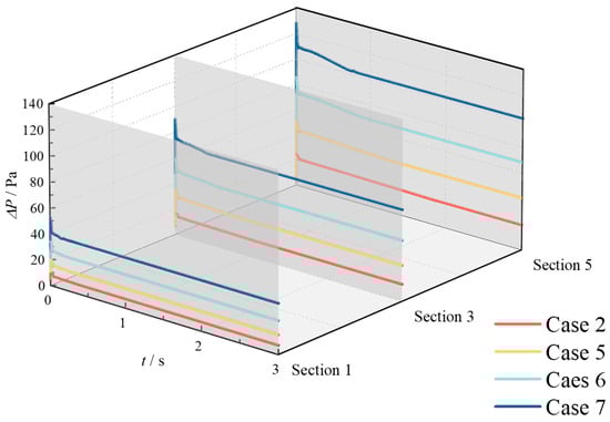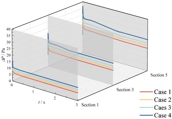 (3) The temporal evolution of the pressure drop reveals three distinct trends: an initial rapid increase, followed by an immediate decrease, and concluding with a gradual reduction until reaching stability. Both HMR and methane flow rate variations influence the pipeline flow dynamics, with increased HMRs and methane flow rates leading to elevated flow rates and corresponding pressure drops. However, the HMR exhibits limited impact on the flow rate, whereas methane flow rate modifications significantly affect the flow rate. Consequently, the pressure drop demonstrates greater sensitivity to variations in methane flow rate compared to hydrogen injection volume.
