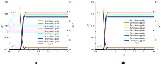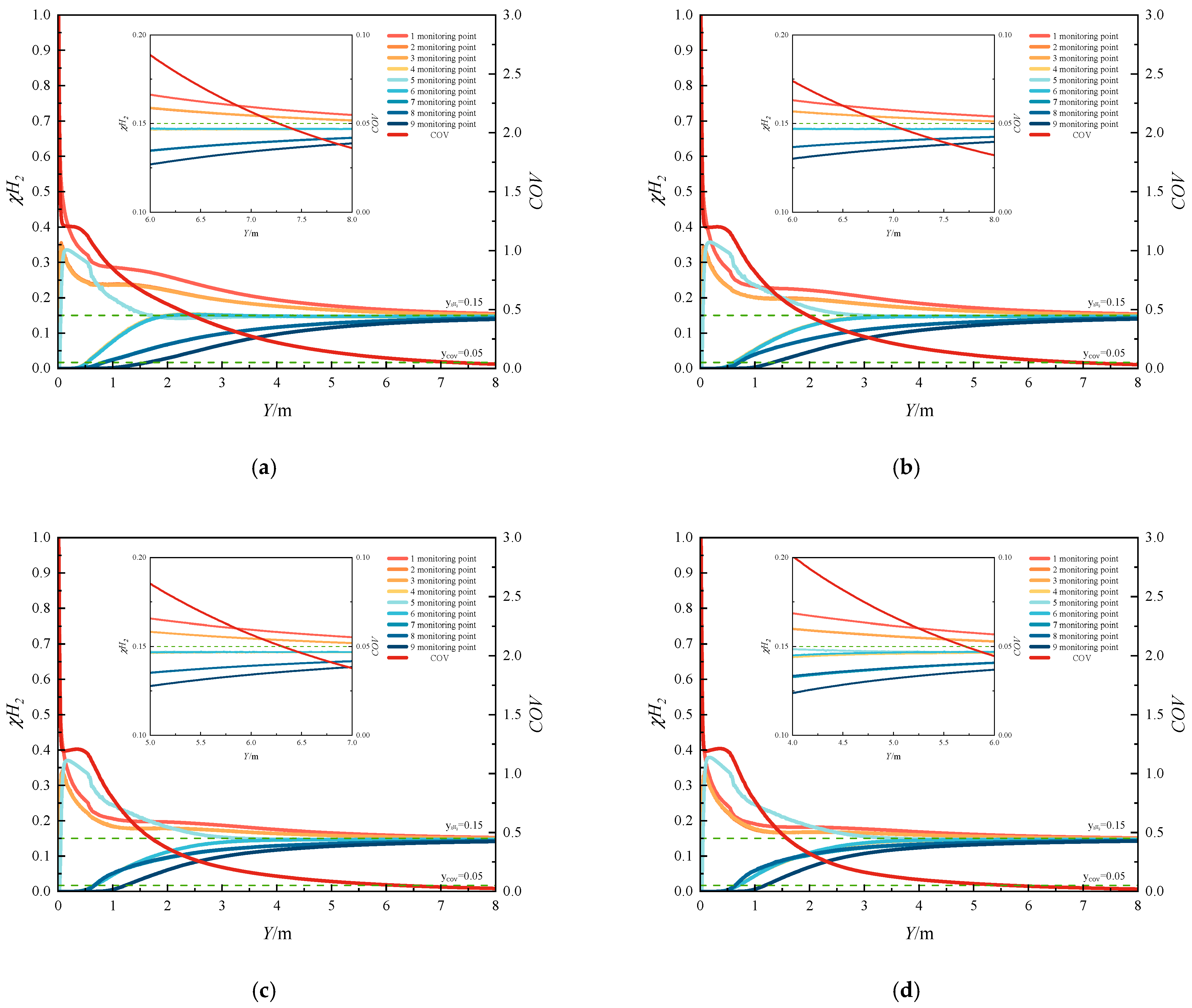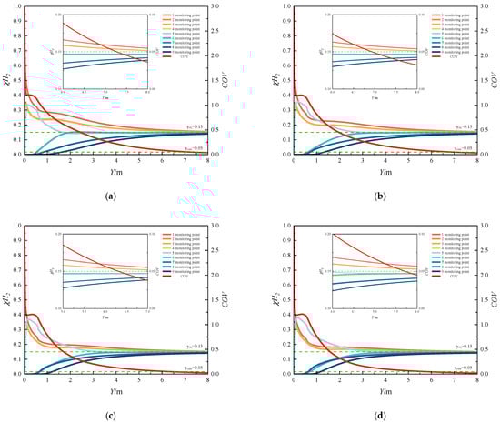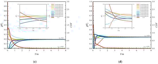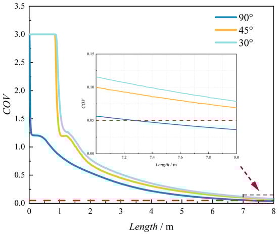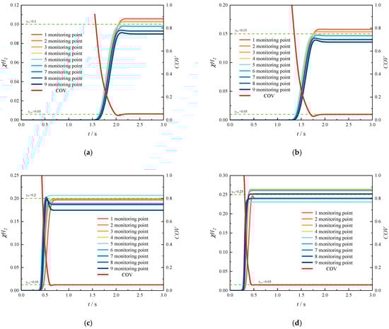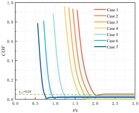 The coefficient of variation (COV) ranges from 0 to 1. A higher COV value indicates greater non-uniformity in gas mixing, while a lower COV value corresponds to enhanced mixing uniformity. In engineering applications, a mixture is typically considered homogeneous when the COV is less than or equal to 0.05. Therefore, this criterion has been adopted in the present study.