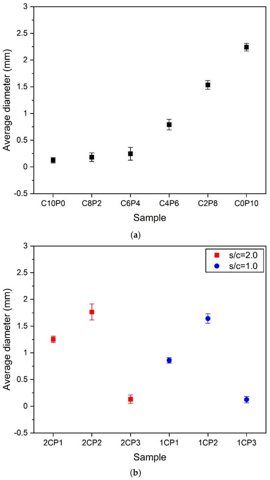 Figure 5 shows the results of measuring the average diameter of the samples. As mentioned above, the change in the average diameter according to the ratio of CP and PL shown in Figure 3 is shown in Figure 5a. As the substitution ratio of PL increases, the value of the average diameter increases. The average diameter of the 100% CP sample, C10P0, is the smallest, but the pore diameters are similar, so the deviation is very small. However, the 60% CP + 40% PL (C6P4) sample showed the largest deviation value among the six samples. This means that the pore expansion effect due to high-temperature curing was clearly observed from the 40% PL substitution ratio. In other words, it can be considered that the substitution ratio at which the pore expansion inhibition effect decreases and the expansion effect is fully expressed is the substitution ratio at 40% PL substitution ratio. As a result, the variability of the change in the diameter size of the pores increased. After that, the average diameter of the PL substitution samples over 60% gradually increased, while the deviation also decreased. Therefore, when mixing CP and PL as lightweight aggregates, it is thought that the substitution rate of PL has a greater effect on increasing the pore diameter size than that of CP.