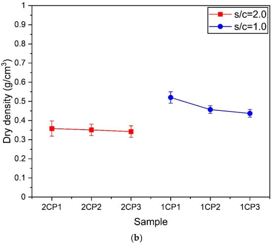 Figure 6. Dry density. (a) Samples according to the change in the exchange rate of CP and PL. (b) Samples according to the change in the amount of CP when s/c = 2.0 and 1.0.