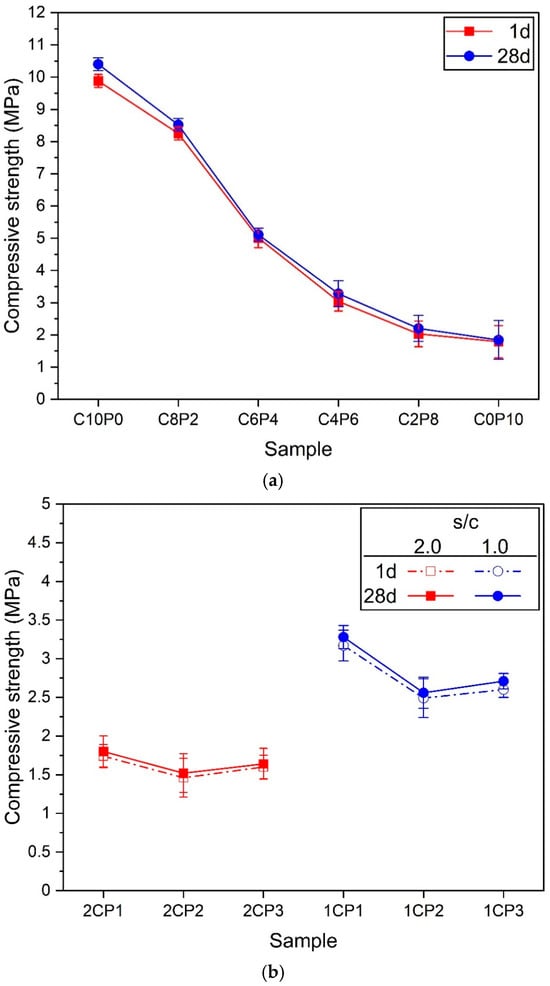 Figure 7. Compressive strengths of samples. (a) Samples according to the change in the exchange rate of CP and PL. (b) Samples according to the change in the amount of CP when s/c = 2.0 and 1.0.