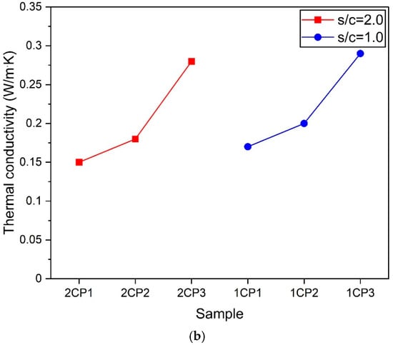 Figure 8. Thermal conductivity of samples. (a) Samples according to the change in the exchange rate of CP and PL. (b) Samples according to the change in the amount of CP when s/c = 2.0 and 1.0.
