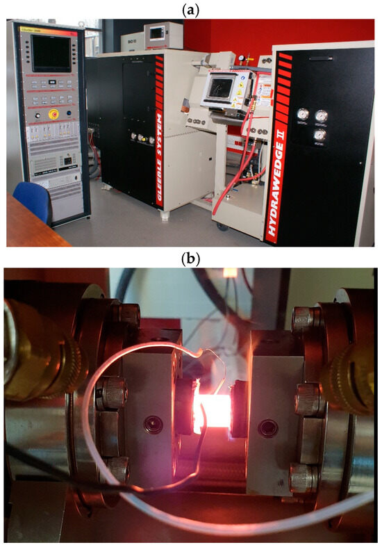 The Gleeble 3800 system equipped with a Hydrawedge Module (a) and an axisymmetric Gleeble sample during compression tests (b).