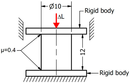 Numerical research was conducted with the use of the FEM in the commercially available software LS-Dyna R.15 0.1 which, due to its possibilities, is widely used in many fields of science [21,22,23,24,25,26,27,28], as well as for metal forming analysis [29,30,31]. The prepared model consisted of three parts: a deformable sample with a diameter of 10 mm and a length L0 of 12 mm, and two anvils with a diameter of 20 mm. As the result of a discretization process, a volume of the sample was divided into 241,050 four-noded tetragonal finite elements with a length in the range of 0.15 to 0.25 mm. The stiffness of the anvils was much higher when compared to the investigated samples (Young’s modulus of the anvil material was 598 GPa); thus, they were treated as rigid bodies. Therefore, the surfaces representing anvils were divided into triangular shell elements. During the Gleeble tests, the temperature of the sample and the anvil was almost the same. Therefore, the heat transfer between the sample and the anvils was negligible. Thus, it was not taken into account. If the temperature of a sample is different than the temperature of the anvils, heat transfer between the sample and anvils should be taken into account [32]. One-way frictional contact was applied between the sample and the rigid anvils. A friction coefficient had been set as 0.4 [19]. All degrees of freedom had been locked for the fixed anvil. For the movable anvil, all degrees of freedom had been locked except translational movement through the sample axis direction. Uniaxial compression of the sample was reached due to the change in the movable anvil position. A strain (ε) value of 1 was assumed. Based on the equation (Equation (1)), the displacement of the anvil, which corresponded to the assumed strain, was calculated as ∆L = 7.6 mm. A scheme of the prepared model is presented in Figure 3.