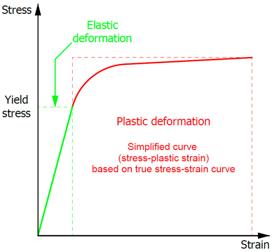 An elastic–plastic material model was selected to describe the stress–strain dependence of the investigated samples. In the selected material model, deformation of the material was elastic as long as the stress did not reach a defined yield stress value. Then, the plastic deformation of the material was described by a multilinear, simplified stress–plastic strain curve. The curves were developed with a number of points that allowed for a good correlation of their course (in a whole range of assumed plastic strain) with curves obtained from Gleeble tests. Thermal strain as well as heating and cooling effects on the material properties’ changes were not taken into account during the numerical investigation, which was focused on the plastic strain distribution during the uniaxial compression of the sample. A schematic stress–strain curve of the selected material model is presented in Figure 4.