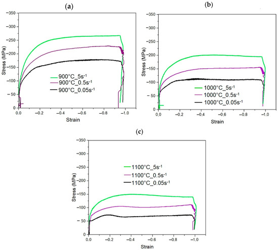 The flow behavior of the steel determined for various hot deformation conditions is especially important in designing and optimizing the hot forging process. The stress–strain curves of the investigated steel compressed at temperatures of 900, 1000 and 1100 °C and at strain rates of 0.05, 0.5 and 5 s−1 are shown in Figure 5. At the initial stage of deformation, the stress values significantly increase due to the formation of dislocations generating significant work hardening. Along with increasing strain, the rate of stress increase gradually decreases. At 900 °C (Figure 5a) and 1000 °C (Figure 5b), after reaching the plateau, flow stresses are at an almost constant level, which is related to the occurrence of a dynamic recovery process leading to dislocation annihilation resulting in the reduction of the work hardening rate [17]. Such a state is typical for the dynamic equilibrium between the dislocation generation and their annihilation due to thermally activated processes occurring in the microstructure [33,34]. As strain continues to accumulate, the effect of dynamic recovery becomes more significant and the rate of stress increase gradually slows down.