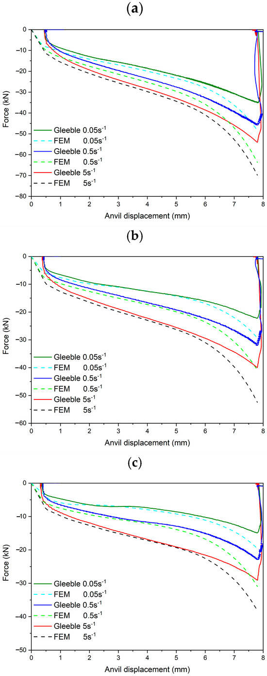 The dependence between the compression force of the movable anvil versus its displacement under various test conditions (temperature and strain rate) is presented in Figure 6. Curves obtained from the experimental and numerical research are characterized by good compatibility. Only two stages of the curves look slightly different. The initial stage is related to the beginning of the test, when strain during the test is not measured perfectly. This effect is observed because samples in the Gleeble 3800 simulator in the Hydrawedge module are installed in a horizontal position and require the application of a small compressive force (about 100 kN) that will allow the sample to be held and the heating and annealing process to be stable during the test. This applied force allows the material to be deformed slightly (flowing), especially at high temperatures, i.e., during annealing at the austenitizing temperature of 1200 °C. Thus, before the final compression begins, the deformation value is zeroed and recalculated in relation to the real height of the sample.