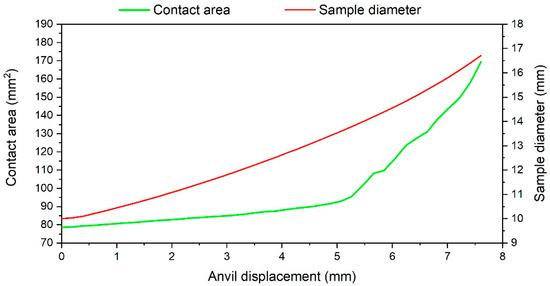 Change in the sample diameter and contact area during the compression test at 1000 °C and strain rate of 0.5 s−1.