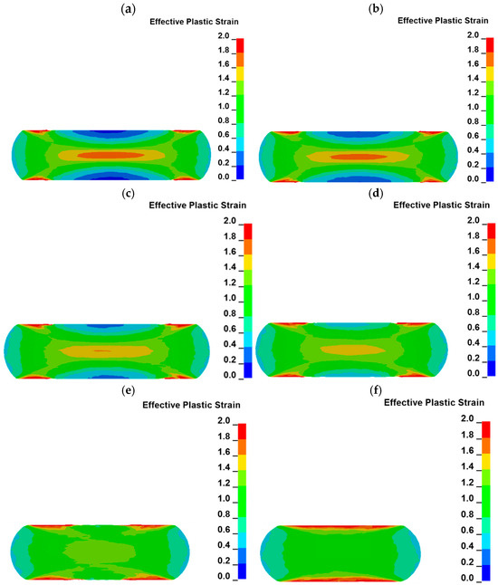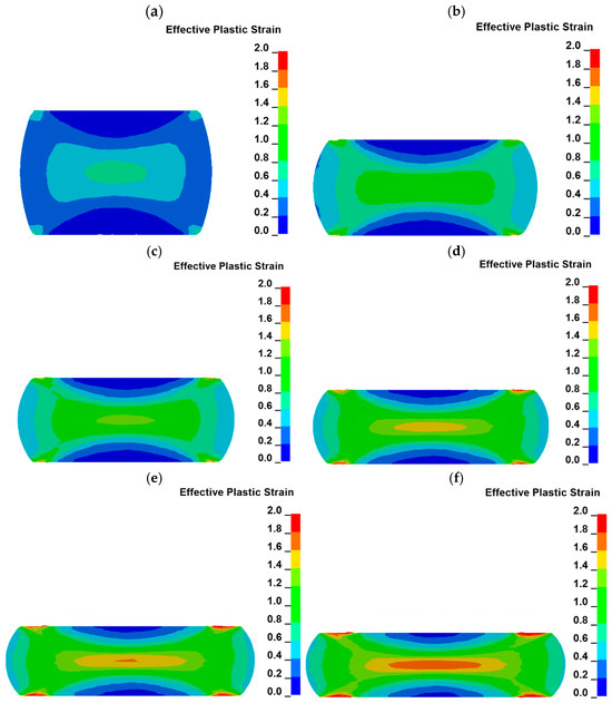 An increase in the plastic strain distribution during uniaxial compression is similar to the letter “X” [42]. Such plastic distribution is registered during the whole test. As can be seen in the presented cross sections, plastic strain starts to increase in the geometrical center of the sample (plastic strain in a range of ca. 1.65–1.75) as well as in the areas near the sample edges (plastic strain in a range of ca. 1.8–2.3), which are the boundaries of the sample and have contact with the anvils. In Figure 8a, the maximum plastic strain is located in the geometrical center of the sample. In all other cross sections, the maximum strain is located in areas near the sample edges connected with anvils. This difference is related to the compression rate of the sample. As the compression is not high enough, as in Figure 8a, the plastic strain increases firstly in the geometrical center of the sample. The plastic strain starts to be higher at the areas near the edges of the sample than at its geometrical center, while the contact area between the sample and anvils starts to increase rapidly (Figure 7). The higher plastic strain distribution in areas located near the edges of the sample is related to the frictional force between the sample and the anvils. The occurrence of friction forces between the sample and the anvils causes also the sample to become a barrel after the compression. The distribution of the plastic strain is in accordance with reports described by other researchers [42,44].
