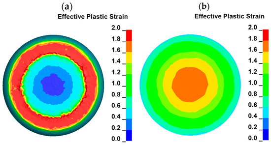 Color-coded maps of plastic strain distribution (temperature of 1000 °C and strain rate of 0.5 s−1): (a) a view from the top of the sample, (b) a view at the middle of the compressed sample height.