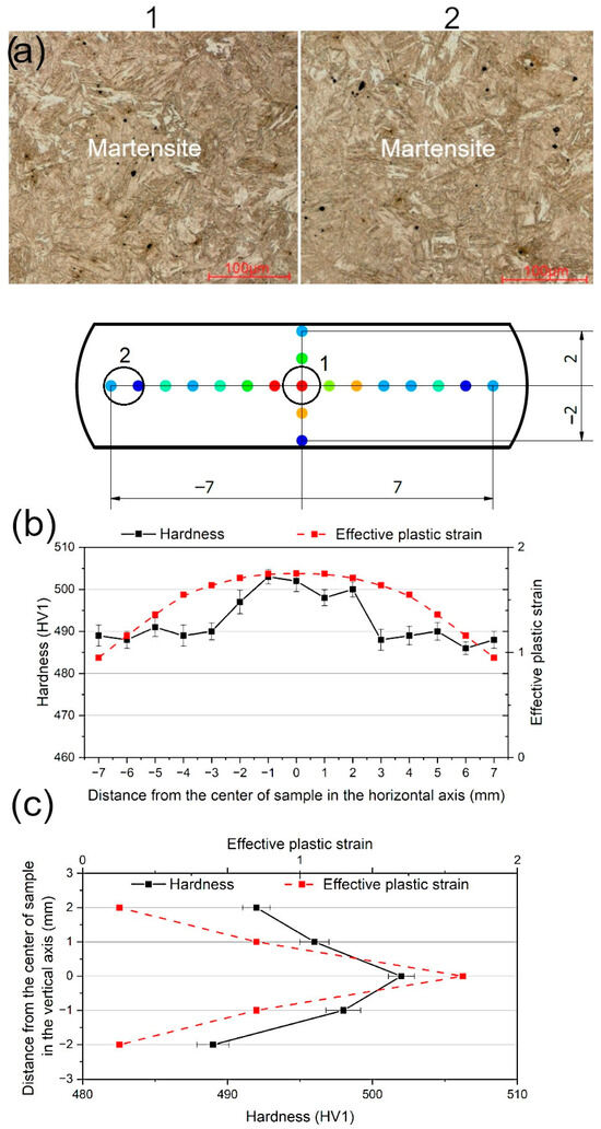 The FEM results were focused on the plastic strain distribution in a sample volume during compression. The developed numerical model did not take into account heating and cooling. The performed experimental and numerical investigations were focused on the hot deformation behavior of the investigated steel instead of any influence of the cooling rate on the microstructure or hardness. In our numerical research, the test conditions such as temperature and strain rate were taken into account by using the experimental stress–strain curves obtained from the Gleeble test results for each investigated case separately. The results of the FEM analysis were experimentally validated by hardness measurements. The measurements were performed along the vertical and horizontal axes of the sample at its geometric center to show the gradient distribution of plastic strain (Figure 11a). Results of hardness measurements reflect the changes in the microstructure of the steel during compression tests. The hardness measurements performed in the vertical and horizontal axes of the sample after the hot compression test carried out at 1000 °C and a strain rate of 0.5 s−1 are shown in Figure 11b,c. The obtained results show different hardness values with various distances from the central zone of the sample. Interestingly, the relatively rapid increase in hardness was measured at the distance of 3 mm from the deformed sample axis (Figure 11b) and in the middle of the sample’s height (Figure 11c), which corresponds to the highest strain ranges identified in the strain distribution maps (Figure 8f). The results of the hardness measurements (Figure 11b,c) show good correlation with the values of plastic strain. The highest hardness (500–503 HV1) measured along the horizontal axis of the sample was associated with the highest values of effective plastic strain~1.65–1.75 (Figure 11b). The highest hardness (502 HV1) measured along the vertical axis of the sample aligned well with the highest value of effective plastic strain~1.75 (Figure 11c). The course of the curves corresponding to the effective plastic strain reflects the trend of the hardness measurements in Figure 11b,c. The rest of the sample shows the almost constant hardness in a range of 486–491 HV1.