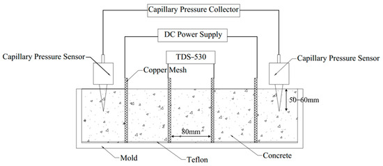 Capillary pressure was measured using a system provided by Chiao Broad Link (710) (CHIAO BROAD LINK(Beijing)Equipment Co, Ltd., Beijing, China) consisting of a data acquisition system, pressure sensors, cone-shaped tubes, and shielded lines. Capillary pressure tests and resistivity tests were performed on the same specimen at the same time. After the concrete was finished casting, a wooden rod with a similar thickness to the cone-shaped tube was inserted 60–70 mm into the concrete surface to displace the coarse aggregate in that position. As shown in Figure 1, the cone-shaped tube was then inserted and fixed, penetrating 50–60 mm into the concrete surface. Before the start of the test, we needed to fill pure water in the conical tube, co, nnect the syringe and the conical tube to the opening, pump the syringe so that the negative pressure inside the conical tube was maintained, and after a period of time, knock the conical tube wall to discharge the air bubbles. We needed to repeat the above steps until there were no air bubbles in the tube, which was the value of the machine on the clearing of the zero before the start of the test. When the concrete surface was slightly dry and the cone-shaped tube could maintain itself at that depth, the fixation of the cone-shaped tube was loosened, allowing it to settle down together with the concrete. The cone-shaped tube was attached to the water in the concrete to form a system, and the pressure sensor could measure the capillary pressure inside the concrete.