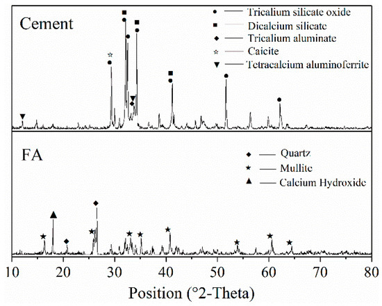 The grade of fly ash was Class II, with a water requirement ratio of 96.4% and an activity index of 73.0%. The X-ray fluorescence (XRF) test results for the chemical composition of the cement and fly ash are listed in Table 4. The particle size distributions of the cement and fly ash are shown in Figure 2. The result of XRD is shown in Figure 3.