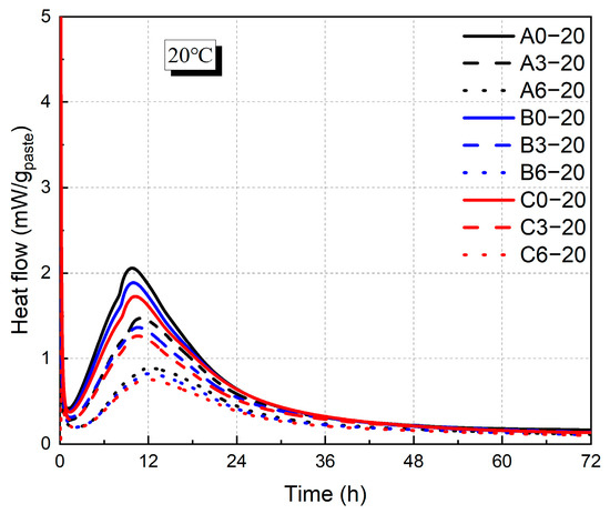 The heat of hydration of the cementitious paste was measured using an eight-channel isothermal calorimeter (TAM AIR, USA/TA Instruments-Waters LLC Co., Ltd., New Castle, DE, USA). Each channel of the isothermal calorimeter contains two chambers, consisting of a sample cell and a reference cell. Circulating air was used as the medium in the constant temperature bath, and the system was adjusted to ensure temperature stability. The isothermal calorimetry measurements were performed at temperatures of 20 °C and 35 °C, with exothermic heat release data continuously recorded for a duration of 72 h. The heat of hydration measurements was systematically conducted on a total of 18 cementitious paste mixtures, taking into account variations in fly ash content (0%, 30%, and 60%), water–binder ratios (0.4, 0.5, and 0.6), and curing temperatures (20 °C and 35 °C).