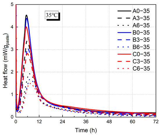 As shown in Figure 4 and Figure 5, the incorporation of fly ash decreased the heat release rate of hydration. At 20 °C, increasing the fly ash admixture from 0% to 60% resulted in reductions in hydration heat by 57%, 50%, and 53% for water–binder ratios of 0.3, 0.4, and 0.5, respectively. In contrast, variations in the water–binder ratio exhibited a relatively minor influence on hydration heat, with an increased water–binder ratio leading to a moderate reduction in the exothermic rate. At 20 °C, for cementitious matrices containing 0% fly ash, an increase in the water–binder ratio from 0.3 to 0.6 led to a 19% decrease in the peak heat of hydration. Moreover, this declining trend diminished with an increase in fly ash replacement, and at a 60% fly ash replacement, the peak hydration heat decreased by 14%. With higher temperatures, the exothermic rate was higher, and the time to reach the exothermic peak was advanced from 10 h to 4.5 h. For the group with a water–binder ratio of 0.3 and 0% fly ash content, the heat of hydration at 35 °C exhibited a pronounced increase of 114%.