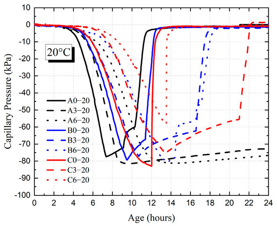 The subsidence of coarse aggregate led to water accumulation in the matrix to form a water layer on the surface (stage I) [38]. Due to the water evaporation and self-drying of the matrix, the thickness of the water film gradually decreased until the particles on the surface were not completely covered with water. Under the action of adhesive force and surface tension, pore water among solid particles formed a meniscus, resulting in capillary pressure (stage II). With the effect of capillary pressure, pore water was forced to the surface, and surface water continued to evaporate, leading to further capillary pressure growth. When the pore water meniscus between cement particles became too small to support, air could penetrate the pore system (stage III), increasing the risk of cracking. As depicted by Figure 6, the corresponding capillary pressure threshold Pa was 28.6 when the air entry time T was 6.7 h. Then, the pore water of the concrete matrix was rearranged, and the capillary pressure continued to increase until it reached the peak Pmax when air penetrated into the test area, which corresponded to the time point Tp (stage IV).