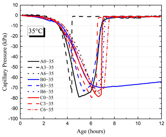 At 35 °C, the value of air entry time T was significantly decreased in each group compared to that at 20 °C environment. Especially for concrete with low water–binder ratio (group A), the internal free water was rapidly consumed by the hydration reaction, which made the connectivity of concrete internal pores poor and caused the water on the concrete surface not to be replenished timely; hence, the values of T and Pa were small. However, in a high-temperature environment, there was no significant effect of increasing the water–binder ratio on delaying the T value, because the rate of water evaporation was the major factor affecting the T value at high-temperature conditions.
