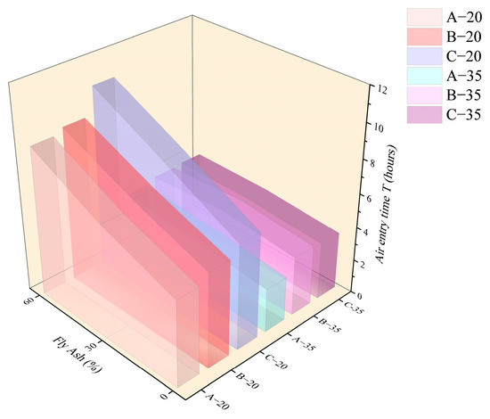 Figure 9 and Figure 10 show the T value and Pa value for each HVFAC with different temperatures. It was shown that the T value and Pa value of each group increased with the increase in fly ash content at 20 °C. At 20 °C, compared to A0, the T values of A3 and A6 were delayed by 1.6 h and 3.7 h, and the value of Pa was reduced by 11.1 kPa and 18.1 kPa, respectively, whereas at 35 °C, the T value of each group showed no significant change with the increase in fly ash content, and only slightly increased with the increase in fly ash content from 0 to 30%. The Pa initially decreased and then, generally there was no significant difference between the fly ash content of 30% and 60%.