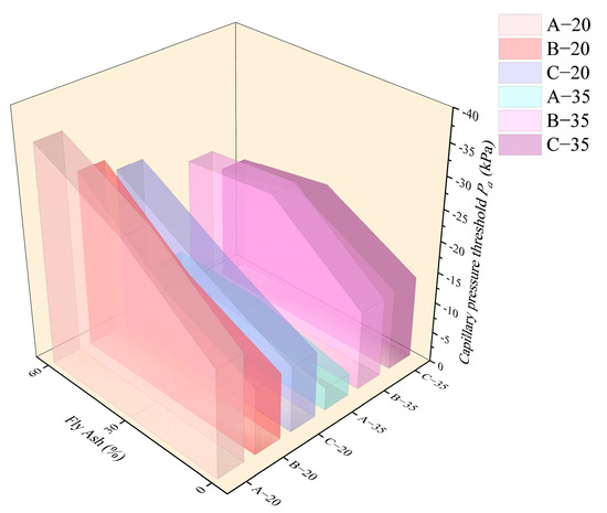 The capillary pressure threshold Pa of HVFAC varies with the water–binder ratio and fly ash admixture under different curing temperatures. At 20 °C, Pa decreases with an increase in fly ash admixture and increases first and then stabilizes with an increase in the water–binder ratio. At 35 °C, Pa first decreases and then increases with an increase in fly ash admixture, and first decreases and then stabilizes with an increase in the water–binder ratio. At low water–binder ratios, Pa increases with increasing curing temperature, while at high water–binder ratios, there is no significant trend observed for Pa.