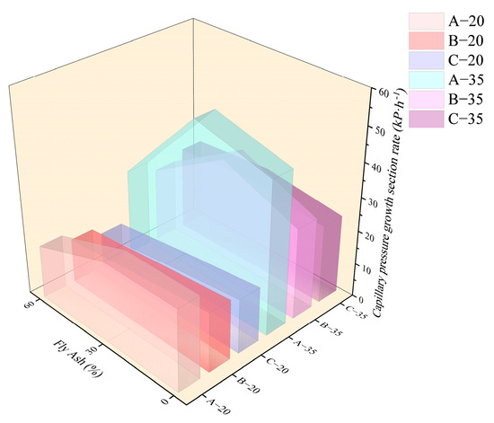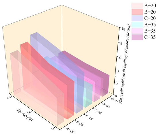 As shown in Figure 9 and Figure 10, in a high-temperature environment, the value of T was advanced generally relative to the 20 °C environment. Figure 11 and Figure 12 demonstrate that the time point and growth rate of the fast increase in capillary pressure were significantly advanced and increased in the 35 °C environment compared to that of the 20 °C environment. In the 35 °C environment, the evaporation rate of water and the hydration reaction of cement were accelerated, resulting in a significant increase in free water consumption. On the other hand, although the addition of fly ash improved the pore structure, the connectivity of the pores decreased, resulting in the migration of water in the concrete matrix that cannot be transferred to the surface timely. Therefore, the difference in T value among all groups was minimal in a high-temperature environment, slightly increased in concrete with fly ash compared to ordinary Portland concrete. The value of Pa was also insensitive to the increase in fly ash content, only increasing slightly compared to ordinary Portland concrete.