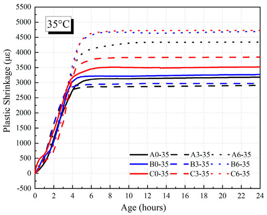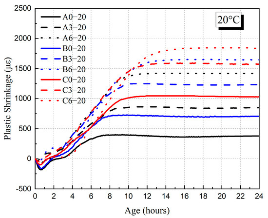 Figure 13 and Figure 14 illustrate that the plastic shrinkage deformation of concrete increased significantly with the increase in the water–binder ratio at 20 °C and 35 °C. With the increase in the water–binder ratio, the free water in the concrete increased, and more water was evaporated in drying condition, resulting in an increase in plastic shrinkage. In addition, the water loss led to an increase in capillary pressure, which further contributed to an increase in the plastic shrinkage of concrete. The plastic shrinkage of concrete increased in all the groups as the curing temperature increased. This was mainly due to the acceleration of the water evaporation rate and the sharp increase in capillary pressure as the curing temperature increased. As shown in Figure 14 and Figure 15, the growth rate and value of plastic shrinkage increased significantly under the high-temperature environment.