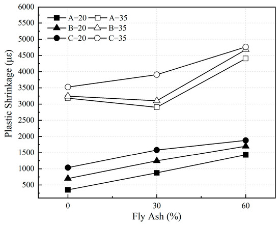 The research [2] indicates that for the early plastic shrinkage of mortar with 030% fly ash replacement, the plastic shrinkage significantly decreases at a 20% replacement level, and further increasing the fly ash content results in very little change in shrinkage values. Wang et al. [42] investigated the shrinkage of concrete in the amount of 0–40% admixture. The results showed that the addition of fly ash improved the resistance of the concrete to plastic shrinkage but also increased the risk of drying-induced cracking under confinement. Wang et al. [43] investigated the effect of different admixtures of fly ash on the plastic shrinkage cracking of fiber concrete, and the results showed that the addition of fly ash affects the pore structure and plastic shrinkage behavior of the paste.