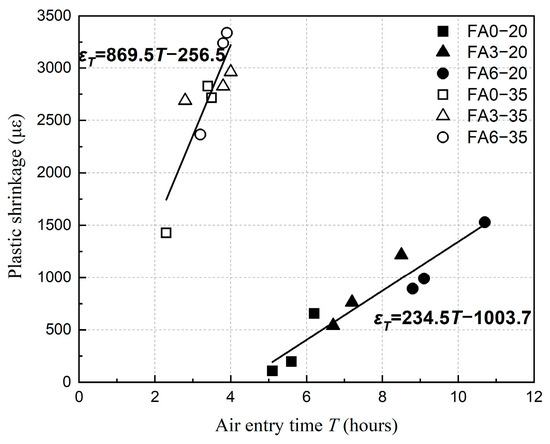 Figure 16 shows the relationship between the air entry time T and εT (the value of plastic shrinkage at time point T). It shows a well-linear relationship between T and εT at both 20 °C and 35 °C environments. The law indicates that the plastic shrinkage is mainly dependent on the rate of water evaporation before time point T, and is proportional to the length of time the concrete was exposed to the environment. Compared with the 20 °C environment, the development of plastic shrinkage was significantly faster in the 35 °C environment, which was mainly due to the increased rate of water evaporation at high-temperature conditions.