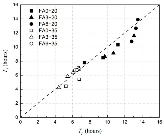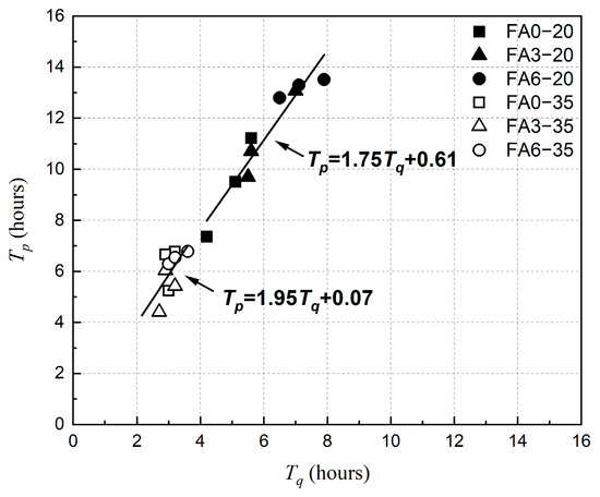 Figure 17 and Figure 18 show the relationship between the Tp (the time point that the Pmax was developed) with Tq (the time point that capillary pressure started to rise) and Ts (the time point that plastic shrinkage stabilized). As shown in Figure 17, it also showed a good linear relationship between Tq and Tp at both 20 °C and 35 °C environments. The linear relationship between Tq and Tp was more pronounced in the 20 °C environment. Due to the faster curing process of concrete in the 35 °C environment, the discrepancy of Tq and Tp was not significant for each concrete, with the value of Tp being approximately twice as high as the value of Tq.