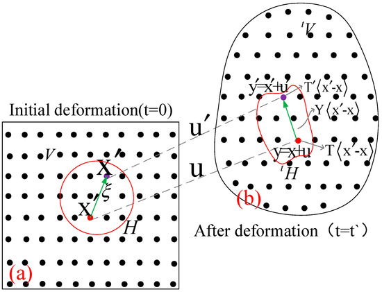 The traditional methods mainly use tests and the finite element method to analyze the structural damage and crack propagation. However, these methods have some disadvantages in solving the problems of crack tip stress, structural meshing and stress field. The objects will discreet into particles as per PD theory. This then determines the radius of interaction between particles and uses the integral algorithm to overcome the shortcomings of existing methods, as shown in Figure 3.