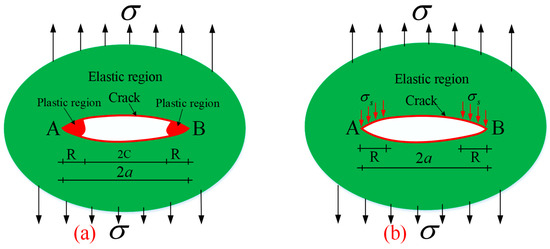 In the process of crack tip opening, passivation, and expansion, there will be a local plastic region will appear at the crack tip, as shown in Figure 6a. Under the action of load, the red regions at the crack tips A and B inside the object are the plastic regions, while the rest of the material is an elastic region. The length of plastic region 2R at crack tips compared with crack length 2C, is that 2C >> 2R, and the material properties in the plastic region reach the limit state and can no longer bear the load. Therefore, the plastic region of the crack tip can be considered as a part of the crack, and the crack length changes from 2C to 2a, transforming the complex elastoplastic problem into an elastic problem, as shown in Figure 6b. Therefore, in this research, elastic theory is used to analyze the model and the crack.