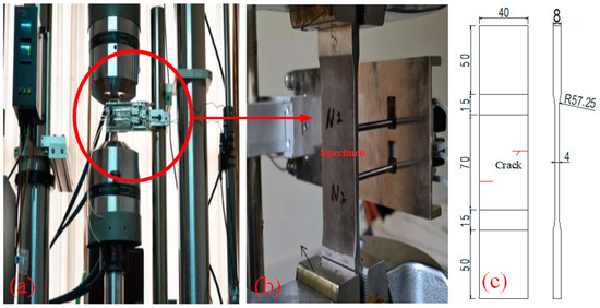 Q345 was used in the test, and the main components were C (0.12~0.20%), Mn (1.00–1.60%), Si (0.20–0.60%), S ≤ 0.040%, P ≤ 0.040%. Elastic modulus , Poisson ratio , and Density at room temperature. The experimental instrument is the electro-hydraulic servo tension testing machine MTS809 (XinGuang, Jinan, China). The experimental loading device, specimen loading process, and specimen model with initial crack are shown in Figure 7. Due to the limitations of test conditions and test equipment, only test analysis of specimens at normal temperature was carried out in this paper. Comparing normal temperature test results with theoretical data confirms that PD theory accurately simulates steel structure damage and failure, supporting its application to high-temperature cases. The experiments adopted the two-dimensional model, which means that PD theory can not only apply the thin plate model, but many three-dimensional models can be simplified into two-dimensional models, and two-dimensional models can also reflect the influence of different cracks or complex loads on the structure. The theoretical formulas given in Section 2.1 are used to calculate the physical and mechanical properties of steel under high temperature.