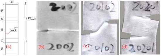 Specimen size and fracture result (mm). (a) Specimen size; (b) 2000×; (c) 2010; (d) 2020.