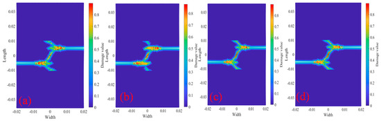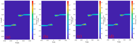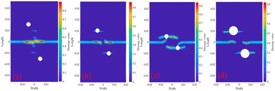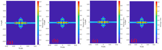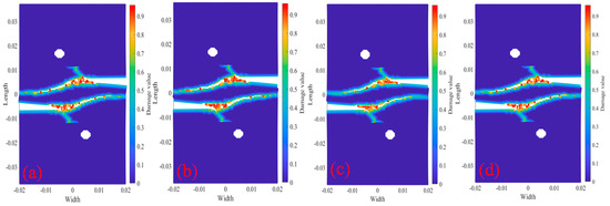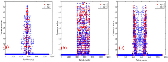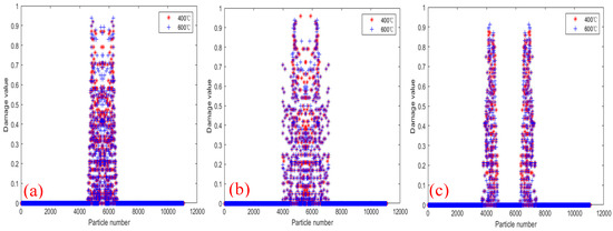 Figure 18 shows the PD particle damage rate results of tests 2000×, 2010× and 2020× under displacement load at 400 °C and 600 °C. It can be seen that the damage rate and damage range of the three tests at 600 °C are higher than those at 400 °C. The results show that although temperature has no significant effect on the crack propagation path of bilateral crack tests, the increase in temperature decreases the physical and mechanical properties of materials, and accelerates the crack propagation rate and local expansion range.