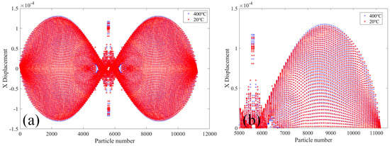 At 20 °C and 400 °C, the 2000× specimen’s displacement in the X-direction. (a) The whole specimen and (b) the top half of the specimen.