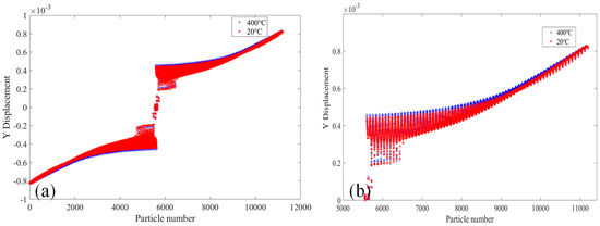 Figure 11 shows the comparative analysis of the displacement change in the Y-direction of the 2000× specimen at the temperatures of 20 °C and 400 °C. Figure 11a shows the displacement in the Y-direction of the whole specimen’s PD particles. It can be seen that the displacement in the Y-direction of the PD particles of the lower part of the specimen moves downward, while the displacement in the Y-direction of the PD particles of the upper part of the specimen moves upward. The displacement in the Y-direction of the PD particles of the two sections of the specimen reaches a maximum and gradually decreases toward the center of the specimen. The displacement value of PD particles in the Y-direction changes abruptly in the crack expansion region of the specimen. Figure 11b shows the displacement of PD particles in the Y-direction of the upper part of the specimen. The displacement of PD particles in the Y-direction of the specimen at 400 °C is slightly larger than that at 20 °C.
