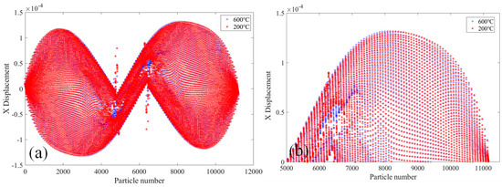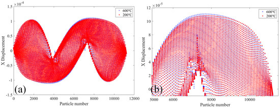 The figure shows the 2020× specimen’s displacement in the X-direction at 200 °C and 600 °C. (a) The whole specimen; (b) the top half of the specimen.