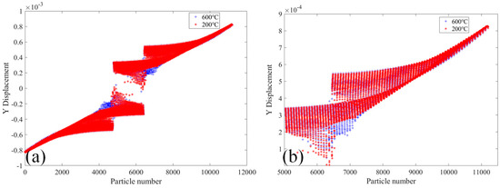 Figure 14 shows the comparative analysis of the change in the Y-direction displacement of the 2010× specimen at 20 °C and 600 °C. It can be seen in Figure 14a that under the two conditions, the change trend of Y direction displacements of the specimen’s PD particles is constant, and the Y direction displacement value of PD particles oscillates and changes in a step form at the crack deflection position. Figure 14b shows the Y-direction displacements of PD particles in the upper part of the specimen. It can be found more obviously that the change of PD particles Y-direction displacement of the specimen under the action of two different temperatures.
