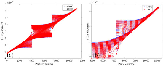 Figure 17 shows the comparative analysis of displacement change in the Y-direction of the 2020× specimen at 20 °C and 600 °C. As can be seen in Figure 17a, the displacements in the Y direction of the PD particles of specimen 2020× are skew-symmetric with respect to the center of the specimen. The displacements in the Y-direction in two sections of the specimen are the largest and gradually decrease toward the center of the specimen. Figure 17b shows the displacement value of PD particles in the Y-direction of the upper half part of the specimen. The change in the displacement value of each PD particle in the Y direction can be inferred that the displacements of PD particles in the Y-direction of the specimen at 600 °C are greater than those at 200 °C.
