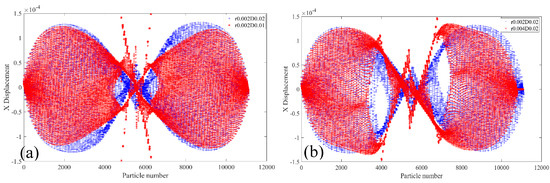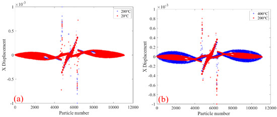 Figure 16 shows the comparative analysis of displacement changes in the X direction of the 2020× specimen at 20 °C and 400 °C. By comparing Figure 16 and Figure 13, it can be seen that the displacements of PD particles in the X-direction of the two types of specimens are similar. The PD particles of specimen 2010× are around the numbers 4300 and 6300, and the displacements in the X-direction are abrupt, while the PD particles of specimen 2020× are around the numbers 4000 and 7000. In both cases, PD particle displacements in the X-direction in the middle region of the two initial cracks of the specimen are close to 0 mm. Figure 16b shows the PD particle displacement in the X-direction of the upper part of the 2020× specimen. It can be seen that the PD particle displacement in the X direction of the specimen at 600 °C is larger than the PD particle displacements at 20 °C.