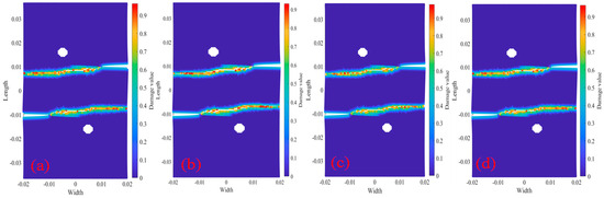 Figure 24 shows the comparison of PD particle damage rates of specimens with bolt holes at 400 °C and 600 °C. Figure 24a shows the comparison results of the damage rates of test 2000R2D10. The damage locations of the tests are mainly concentrated in the center of the specimens. Figure 24b is the comparison result of the damage rate of tests 2010R2D30. It can be seen that the longitudinal distance of the crack decreases, and there is a bifurcation phenomenon during crack propagation. Figure 24c shows the comparison result of the damage rate of test 2020R2D30. It can be seen that the crack paths are not affected by the bolt holes, and propagation paths along the straight line, and finally form two parallel cracks. The comparative analysis of the damage rates of the three specimens shows that the PD particle damage rate of the 600 °C specimen is slightly higher than that of the 400 °C. The higher the temperature, the faster the particle damage rate and the larger the damage range.