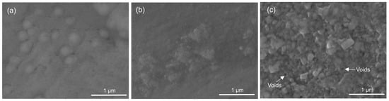 The top view of the thin tantalum oxide films is shown in Figure 1. All coatings demonstrated integrity and good adherence to the substrates. Deposited at 400 °C (Figure 1a), the coating’s topography exhibits small spherical-like peaks, showing neither grain boundaries nor crystallites. These spherical clusters seem well adherent to one another. The thin films grown at 450 °C (Figure 1b) represent small crystallised grains with some clustered areas of agglomerated formations. The grains’ size varies and the granular structure is not fully mature. The growing number of tiny, distinct crystallites indicates that the crystallisation is progressing. At a higher temperature (500 °C, Figure 1c), the morphology of the coating suggests the presence of larger crystallites with polycrystalline growth and few pores. At a substrate temperature of 400, 450, and 500 °C and a tantalum melting point of 3017 °C, the homologous temperature at deposition (Tm) was about 0.13, 0.15, and 0.17. It follows that all films are in Zone T of the structure zone model (SZM) presented by Thornton but have a poor crystalline structure akin to Zone 1. Raising the substrate’s temperature alters the surface mechanism of the film nucleation and speeds up the energy of the bombardment ions, causing the formation of crystalline structures with more densely packed grains. Atomic motions increased as the temperature rose, and they collided with one another. Nonetheless, it turns out that the films’ formations have surface-located voids and pinholes (Figure 1c).